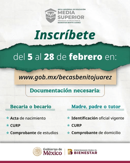 El registro para la Beca Benito Juárez de bachillerato estará disponible del 5 al 28 de febrero.