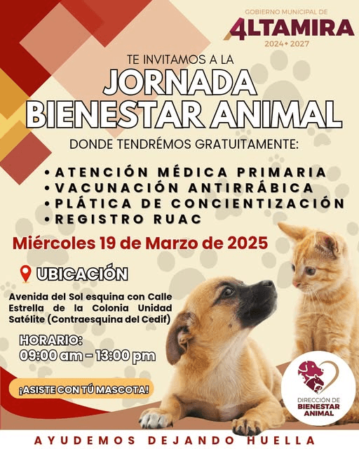 La Dirección de Bienestar Animal te invita a aprovechar los servicios GRATUITOS que estarán disponibles en tu localidad: