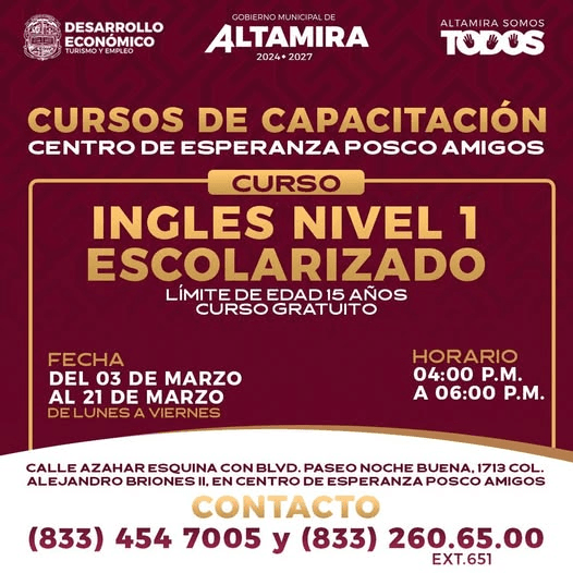 La Dirección de Desarrollo Económico, Turismo y Empleo, a través de la Coordinación de Empleo y Capacitación, te invita a inscribirte en el Curso Gratuito de Inglés Nivel 1 Escolarizado.