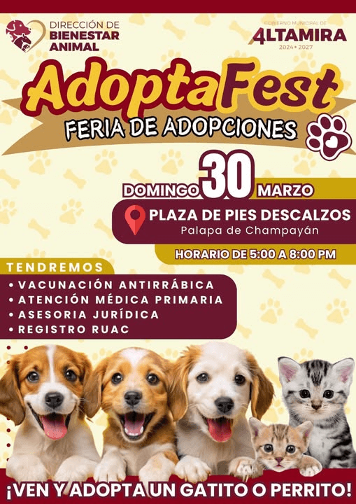 Te invitamos al #AdoptaFest , una Feria de Adopciones donde podrás conocer a mascotas llenas de amor, en busca de un hogar responsable. ¡Ven y encuentra a tu nuevo compañero peludo!
