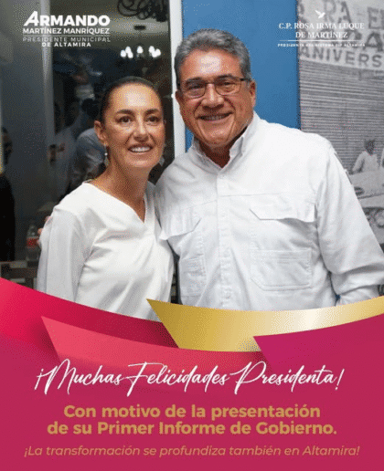 Desde Altamira celebramos con orgullo el Primer Informe de Gobierno de nuestra Presidenta de la República, Dra. Claudia Sheinbaum Pardo, quien ha demostrado que en el tiempo de las mujeres, la Cuarta Transformación avanza con compromiso, transparencia y grandes resultados.