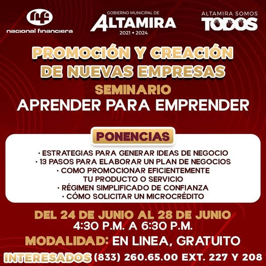 La Dirección de Desarrollo Económico, Turismo y Empleo del Ayuntamiento de Altamira y Nacional Financiera convocan al seminario de: