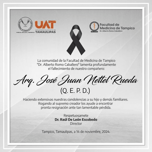 La comunidad de la Facultad de Medicina de Tampico «Dr. Alberto Romo Caballero» lamentamos profundamente el fallecimiento de nuestro compañero Arq. José Juan Nettel Rueda.