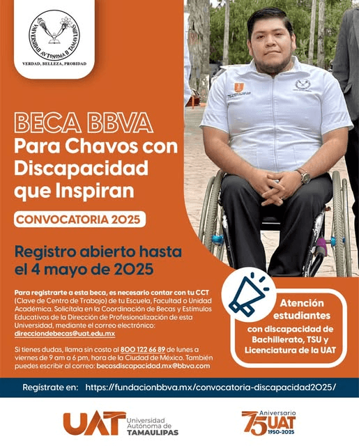 ¡Excelentes noticias! Ya está abierta la convocatoria de Becas BBVA para Chavos con Discapacidad que Inspiran. Si eres estudiante de la UAT y cumples con los requisitos, esta es tu oportunidad para acceder a un apoyo que puede marcar la diferencia en tu trayectoria académica.