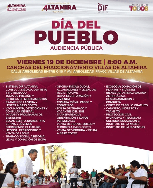 Continuamos impulsando el Día del Pueblo como un espacio de cercanía y atención directa para las familias altamirenses. Este viernes 19 de diciembre, a partir de las 8:00 de la mañana, estaremos presentes en las canchas del Fraccionamiento Villas de Altamira, ofreciendo servicios médicos, trámites, asesorías, programas sociales, lentes a bajo costo y diversos apoyos más. En Altamira, gobernamos de la mano del pueblo y para el bienestar de todas y todos.