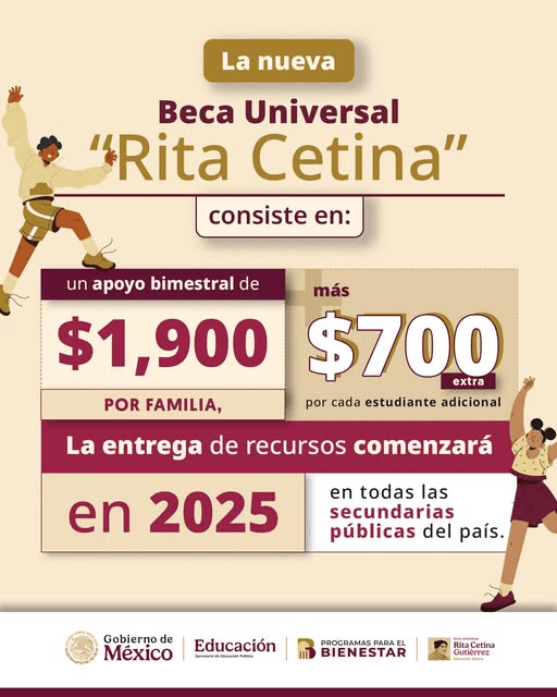 A partir de 2025, la Beca «Rita Cetina» otorgará $1,900 por familia beneficiaria con un estudiante en secundaria, más $700 extra por cada hija o hijo cursando el mismo grado educativo. 👧🏻👦🏻