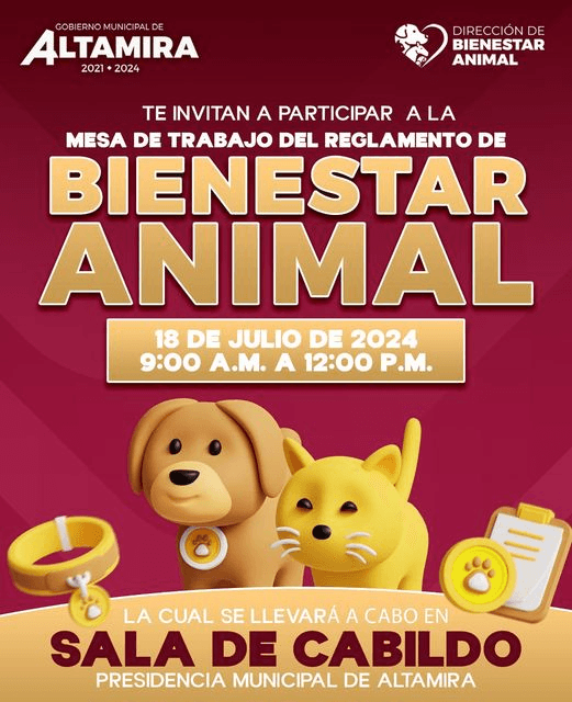 El Gobierno Municipal de Altamira a través de la Dirección de Bienestar Animal te invitan a participar en la Mesa de Trabajo del Reglamento de Bienestar Animal.