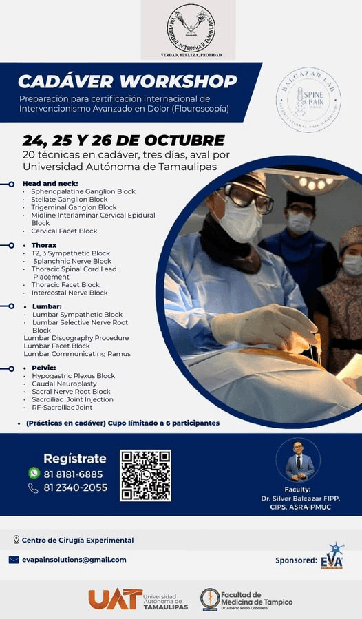 En donde se impartirá preparación para Certificación Internacional de Intervencionismo Avanzado en Dolor impartido por el Dr. Silver Balcázar.
