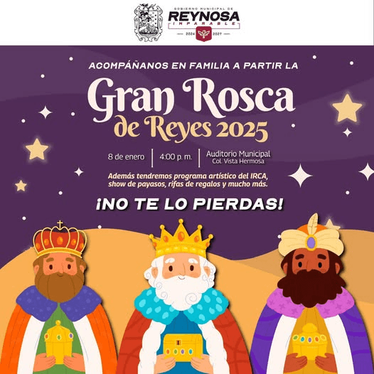 Nos vemos el miércoles 8 de enero a las 4:00 p.m. en nuestro Auditorio Municipal, ubicado en Vista Hermosa, para disfrutar juntos de la tradicional Rosca de Reyes. 🤩