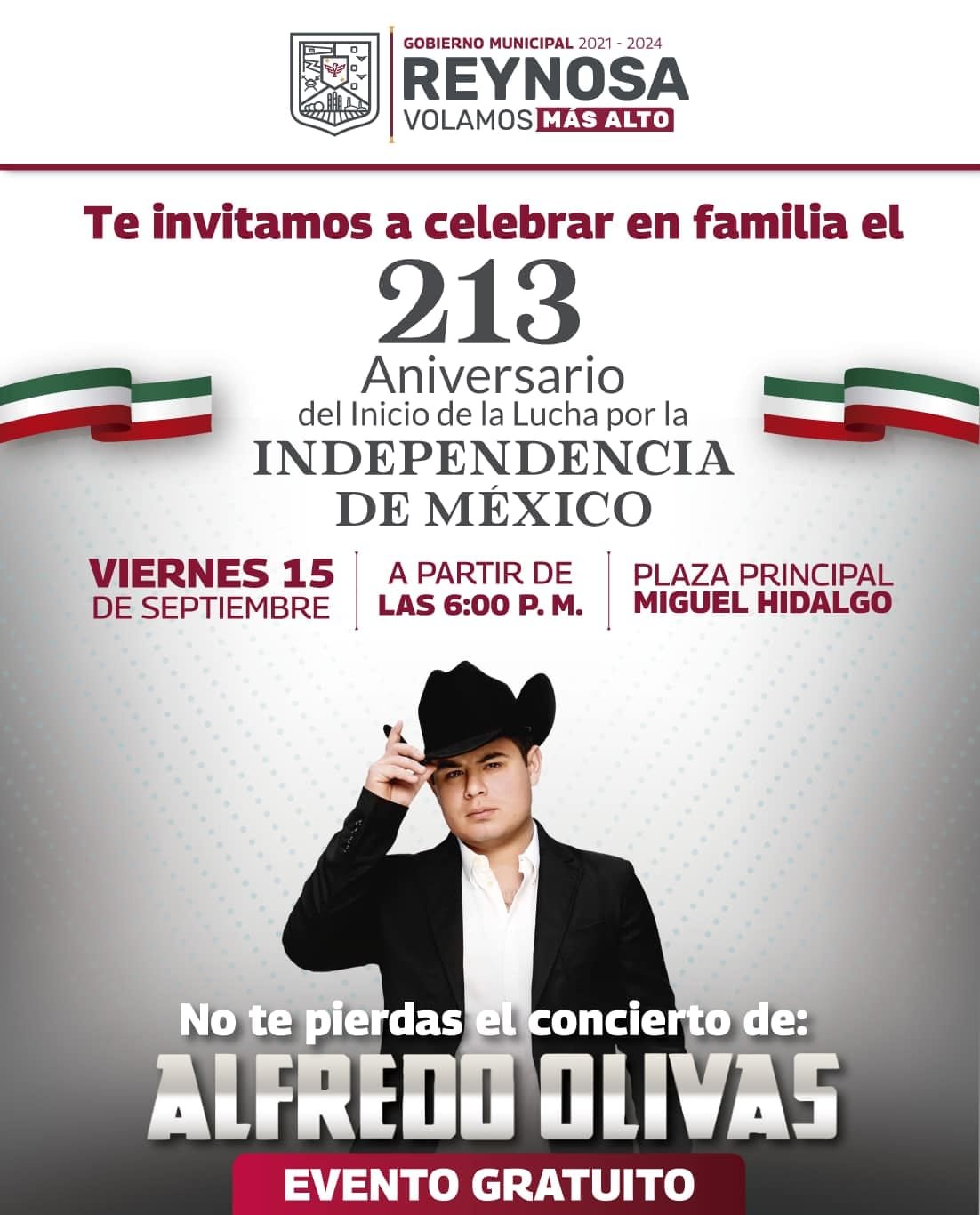 🚨¡Atención, Reynosa!🚨 Me complace invitarlos a todos a celebrar en familia el 213 Aniversario del Inicio de la Lucha por la Independencia de México. Será una noche llena de alegría, música y espectáculo.