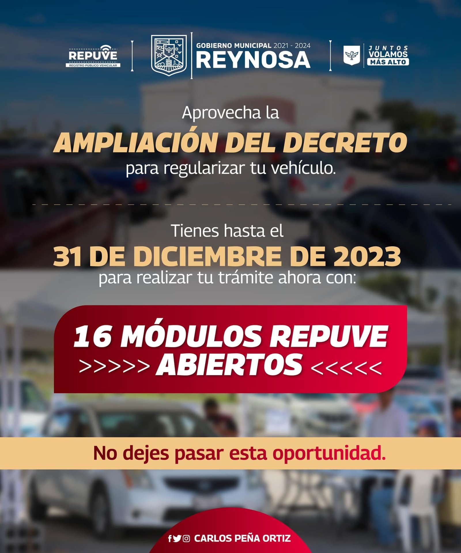 El Gobierno de Reynosa tiene como objetivo principal velar por su bienestar y comodidad. Por ello, me complace anunciarles la extensión del Programa de Regularización de Vehículos Usados de Procedencia Extranjera, #REPUVE. Hemos dispuesto 16 carriles en el patio del Auditorio Municipal, ubicado en el fraccionamiento Vista Hermosa. Y tendrán una capacidad para atender hasta 500 citas diariamente. Aprovechen esta oportunidad única, ya que el programa estará disponible hasta el 31 de diciembre del 2023, de lunes a viernes, de 8:00 A. M. a 4:00 P. M. Podrán realizar la regularización de su vehículo de procedencia extranjera siguiendo los mismos lineamientos establecidos previamente en el Decreto. ![]()