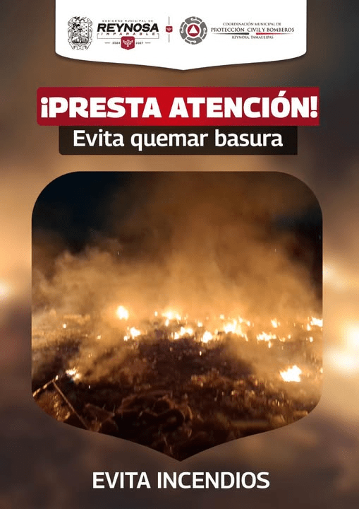 En Reynosa, el equipo de Protección Civil y Bomberos ha atendido recientemente varios incendios provocados, que ponen en riesgo la seguridad de las familias, el medio ambiente y el patrimonio de la ciudad. La quema de basura contamina, puede salirse de control y causar daños graves; no está permitida y tiene consecuencias. Se invita a la ciudadanía a denunciar de forma anónima a quienes realicen estas prácticas para proteger a nuestra comunidad.
