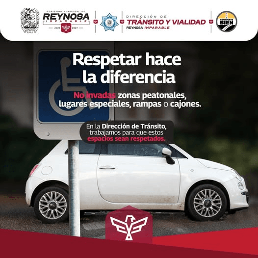 Por favor, recordemos la importancia de respetar las zonas peatonales, lugares especiales, rampas y cajones destinados para quienes más lo necesitan. ¡Juntos hacemos de Reynosa un lugar más seguro y accesible para todos! 👟🚶♂️🚗