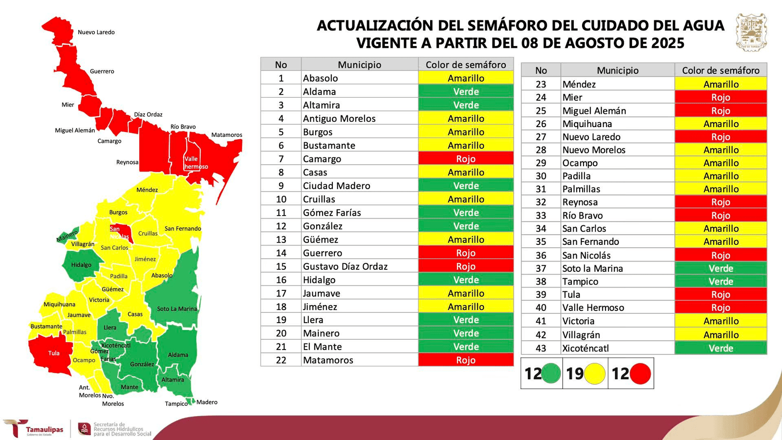 El 8 de agosto de 2025, en Nuevo Laredo, se realizó la Vigésima Primera Reunión Ordinaria del Comité de Seguimiento y Evaluación del Semáforo del Cuidado del Agua, donde se aprobó la actualización de los colores para los 43 municipios de Tamaulipas. El Gobierno del Estado, mediante la Secretaría de Recursos Hidráulicos para el Desarrollo Social, refrenda su compromiso con el uso eficiente y responsable de este recurso vital, invitando a la ciudadanía a participar activamente en su preservación. Se exhorta a consultar las recomendaciones correspondientes al color asignado en cada municipio para mantener el semáforo en verde y garantizar un futuro sustentable.