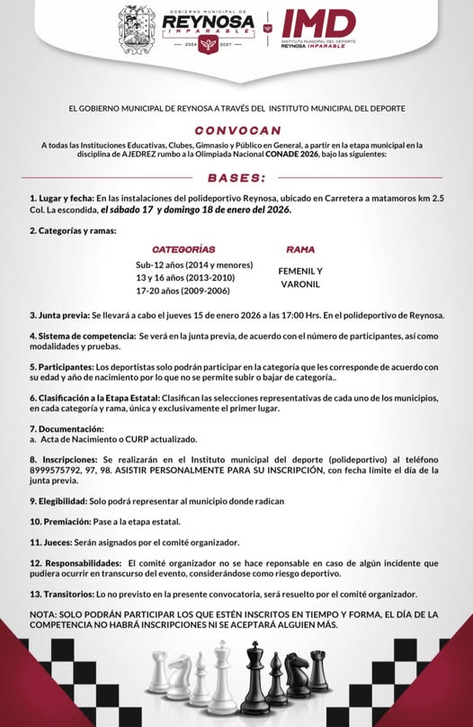 El IMD Reynosa invita a escuelas, clubes y público en general a participar en la Olimpiada Municipal de Ajedrez, clasificatoria rumbo a la Olimpiada Nacional CONADE 2026. 📍 Polideportivo Reynosa