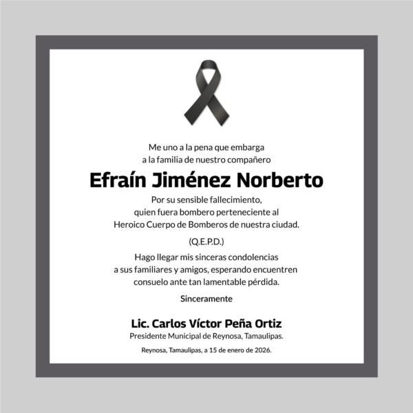 Con profundo respeto despedimos a Efraín Jiménez Norberto, valiente integrante del Heroico Cuerpo de Bomberos y Protección Civil, ejemplo de entrega y vocación de servicio. Su legado vivirá en la memoria de sus compañeros y en el agradecimiento de toda Reynosa.