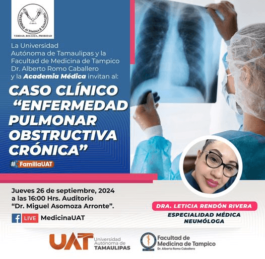 Te invitamos a que asistas al caso clínico “Enfermedad Pulmonar Obstructiva Crónica”, en donde la Dra. Leticia Rendón Rivera, especialista en Neumología, compartirá su experiencia y conocimientos sobre esta importante condición ![]()