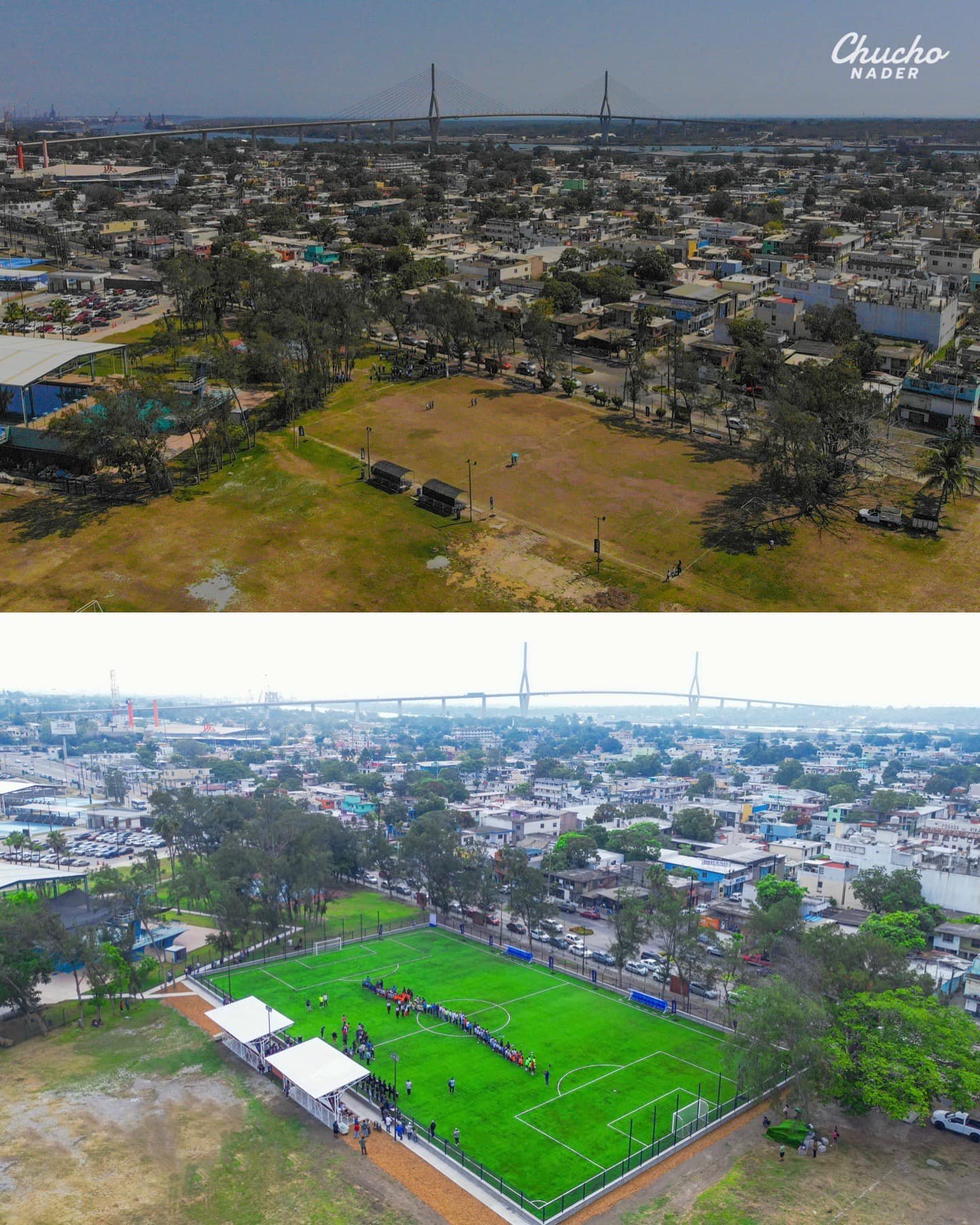El legendario campo de futbol Joaquín Badillo de la ciudad Deportiva de Tampico, luce totalmente renovado, con una inversión superior a los 6 MDP. Les comparto esta foto del antes y el después. Hoy orgullosamente está listo para recibir a los deportistas y nuevos talentos tampiqueños.
