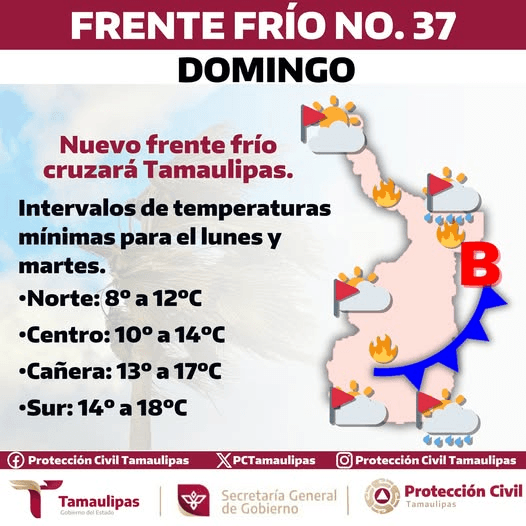 🔵 El frente frío número 37 se encuentra próximo a cruzar Tamaulipas, lo que provocará un ingreso de aire frío en la región. Como consecuencia, se anticipa la probabilidad de lloviznas y lluvias ligeras aisladas en las zonas Norte y Sur del estado. Además, se espera un evento de “Norte”, con ráfagas de viento que podrían alcanzar entre 55 y 75 km/h, así como un ligero a moderado descenso en las temperaturas durante el domingo.
