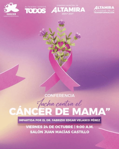 El Instituto de la Mujer de Altamira te invita a la conferencia “Lucha contra el cáncer de mama”, impartida por el Dr. Fabrizio Edgar Velasco Pérez.