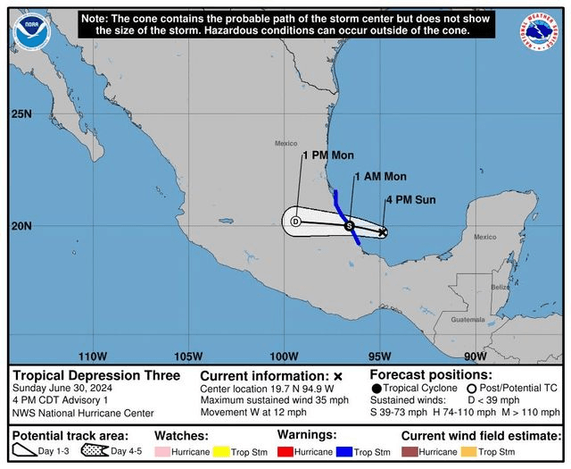 Se formó la depresión tropical tres de la temporada al Suroeste del Golfo de México con vientos sostenidos de 55 km/h, se ubica 300 km al ESE de Tuxpan, Veracruz y se desplaza al Oeste a 19 km/h.