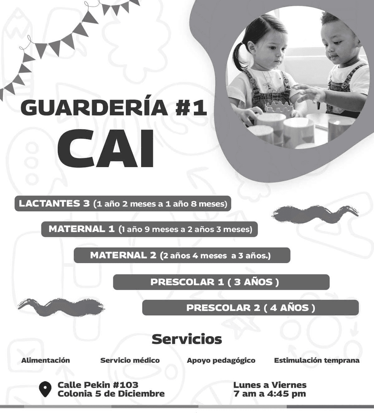 El Sistema DIF Reynosa proporciona protección y cuidado a niños y niñas en la Guardería 1, ubicada en calle Pekín número 103, en la colonia 5 de diciembre, ofreciendo una estancia segura mientras las madres y padres trabajan.