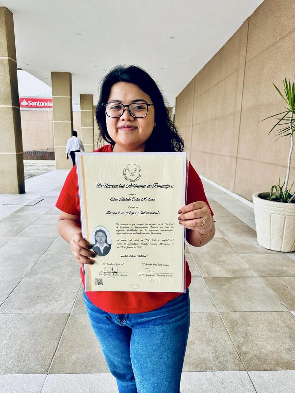 ¡Felicidades a nuestra egresada Edna Cortez por obtener su título en Negocios Internacionales! 🧑‍💼🎓👏