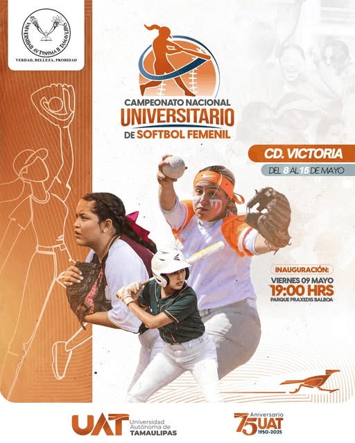 Del 8 al 15 de mayo, la Universidad Autónoma de Tamaulipas será escenario del Campeonato Nacional Universitario de Softbol Femenil, donde equipos de instituciones públicas y privadas competirán con entrega y pasión en cada juego.
