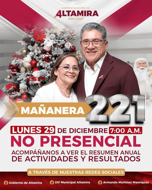 Este lunes 29 de diciembre los invitamos a seguir la Mañanera 221, la cual no será presencial y se transmitirá exclusivamente a través de nuestras redes sociales oficiales, en punto de las 7:00 a.m. Compartiremos un resumen anual de actividades y resultados que continúan impulsando la transformación de Altamira.