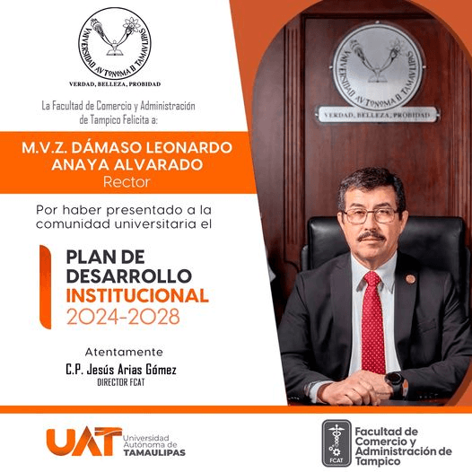 Felicitamos a nuestro Rector el MVZ. Dámaso Anaya Alvarado por la presentación del Plan de Desarrollo Institucional 2024-2028 de nuestra Universidad Autónoma de Tamaulipas.