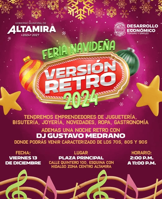 Viernes 13 de Diciembre a partir de las 2:00 p.m. en la Plaza Constitución Altamira con emprendedores y Noche Retro a partir de las 6:00 p.m. Ambiente Chavorrucos.