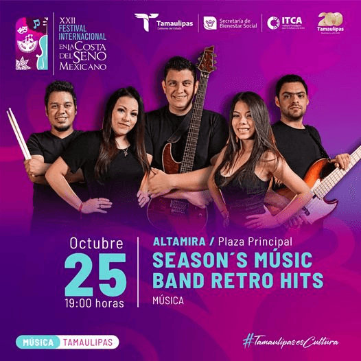 El viernes 25 de octubre inicia en Altamira el Festival Internacional en la Costa del Seno Mexicano con la presentación de Season’s Músic Band Retro Hits en la Plaza «Constitución» del centro de la ciudad a partir de las 7:00 PM ¡Entrada libre! ¡No faltes! ![]()