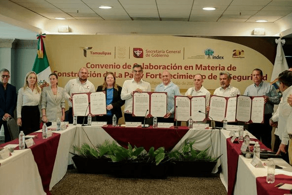 Se llevó a cabo la Firma de Convenio de Colaboración en Materia de Construcción de la paz y en Fortalecimiento de la Seguridad, por parte del gobernador Américo Villarreal y el presidente del Consejo Nacional de la Industria Maquiladora y Manufacturera de Exportación (INDEX), Humberto Martínez Cantú.