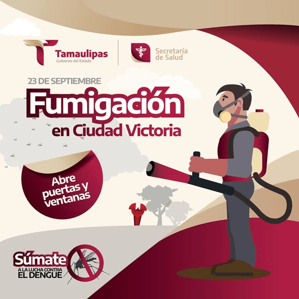 Este 23 de septiembre, por indicaciones del gobernador, Américo Villarreal Anaya, a través de la Secretaría de Salud continúa la fumigación contra el Dengue (si las condiciones climatológicas lo permiten) mediante la brigada especial en zonas de Ciudad Victoria.