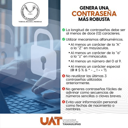 Queremos reforzar la seguridad de la información y servicios que tienes con tu cuenta institucional, es por eso, que a partir del 25 de junio se actualizan los mecanismos para robustecer la contraseña de uat.edu.mx, por lo que en tu siguiente cambio de password deberás cumplir con algunos requisitos como mínimo.
