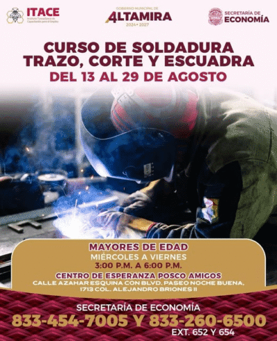 La Secretaría de Economía, a través de la Coordinación de Empleo y Capacitación, invita a todas las personas interesadas a inscribirse en el Curso de Soldadura: Trazo, Corte y Escuadra.