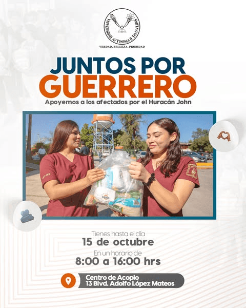 Hoy más que nunca, nuestra comunidad universitaria se une por una causa que trasciende fronteras. El estado de Guerrero nos necesita tras el paso del huracán John, y juntas y juntos podemos marcar la diferencia. ![]()