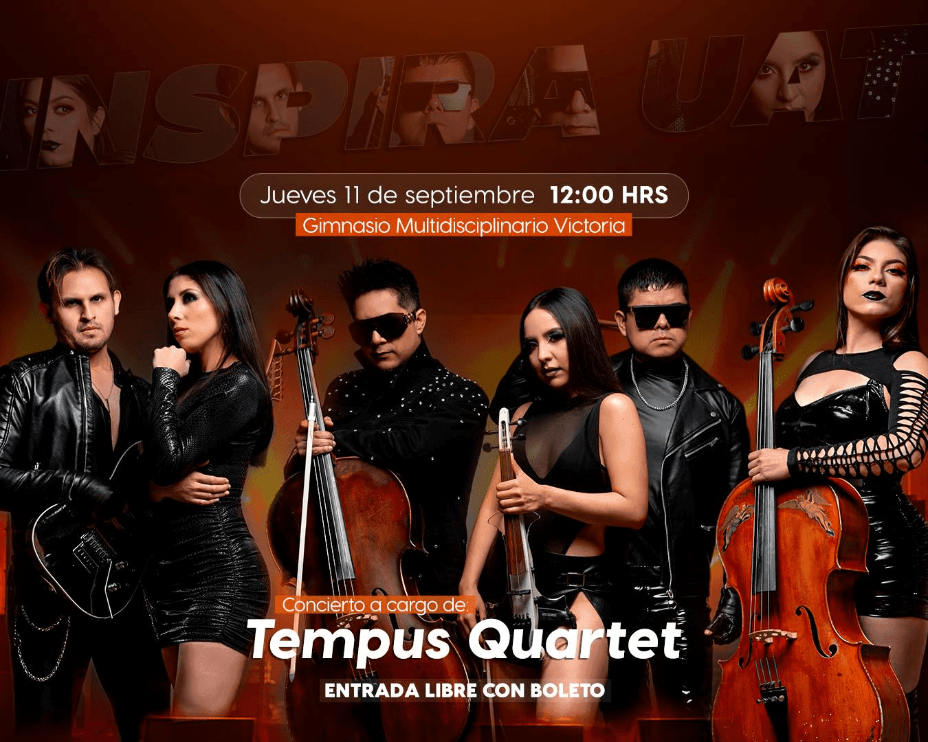 El jueves 11 de septiembre vive una experiencia exclusiva para estudiantes UAT con el talento de Tempus Quartet, un ensamble que fusiona lo clásico con lo moderno. 🤩🎻