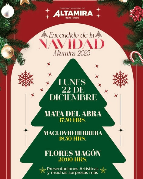 La magia navideña continúa recorriendo Altamira y este lunes 22 de diciembre te invitamos a ser parte del Encendido Navideño Altamira 2025. A las 5:30 de la tarde en Mata del Abra, a las 6:30 en Maclovio Herrera y a las 8:00 de la noche en Flores Magón. Disfrutemos juntos de presentaciones artísticas y muchas sorpresas más. Durante esta temporada se han encendido 19 pinos tanto en la zona rural como urbana. ¿En qué lugares te gustaría que se colocaran más pinos el próximo año? 🎄✨