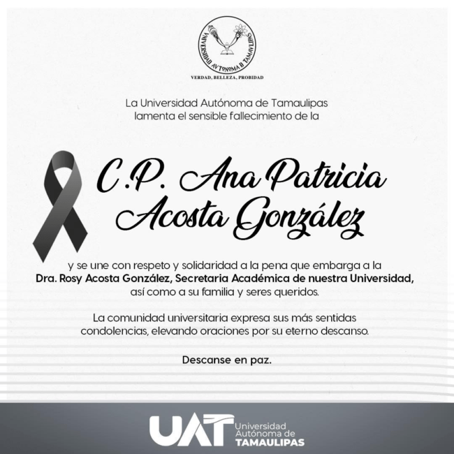 La Universidad Autónoma de Tamaulipas manifiesta su profundo pesar por el fallecimiento de la C.P. Ana Patricia Acosta González.