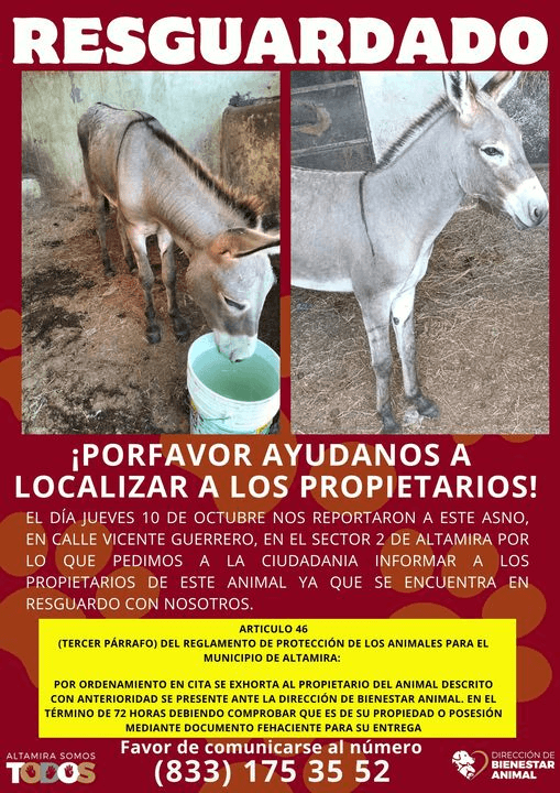Se busca al propietario de este asno que el día jueves 10 de octubre de 2024 nos reportaron, mismo que se realizo la captura y resguardo, el cuál fue localizado en área verde de la calle Vicente Guerrero, en el sector 2 de Altamira.