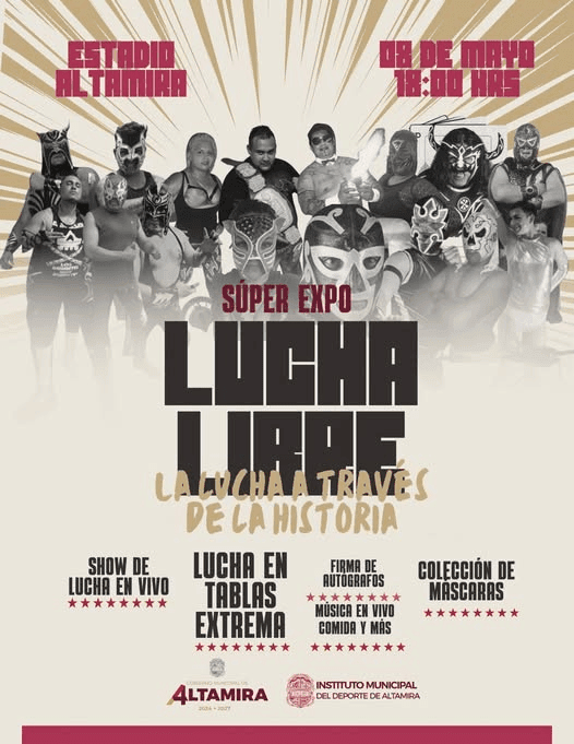Este 8 de mayo a las 18:00 hrs, vive la emoción de la lucha libre en el Estadio Altamira. Prepárate para un espectáculo lleno de adrenalina, con máscaras, llaves y vuelos espectaculares que harán vibrar Tamaulipas.