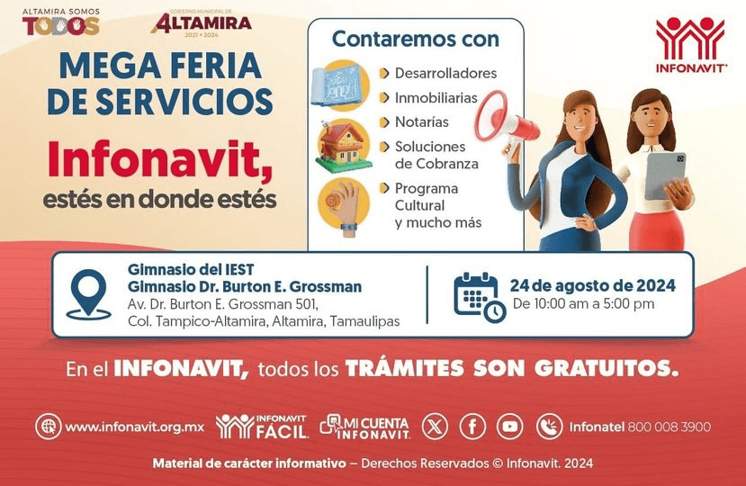 El Gobierno Municipal de Altamira y el Instituto del Fondo Nacional de la Vivienda para los Trabajadores te invitan a la Mega Feria de Servicios INFONAVIT ![]()