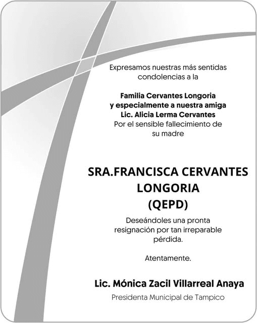 La presidenta municipal de Tampico expresa sus más sinceras condolencias a la Familia Cervantes Longoria, en especial a la síndica del Ayuntamiento de Ciudad Madero, Lic. Alicia Lerma Cervantes, por el sensible fallecimiento de su madre, la Sra. Francisca Cervantes Longoria (QEPD).