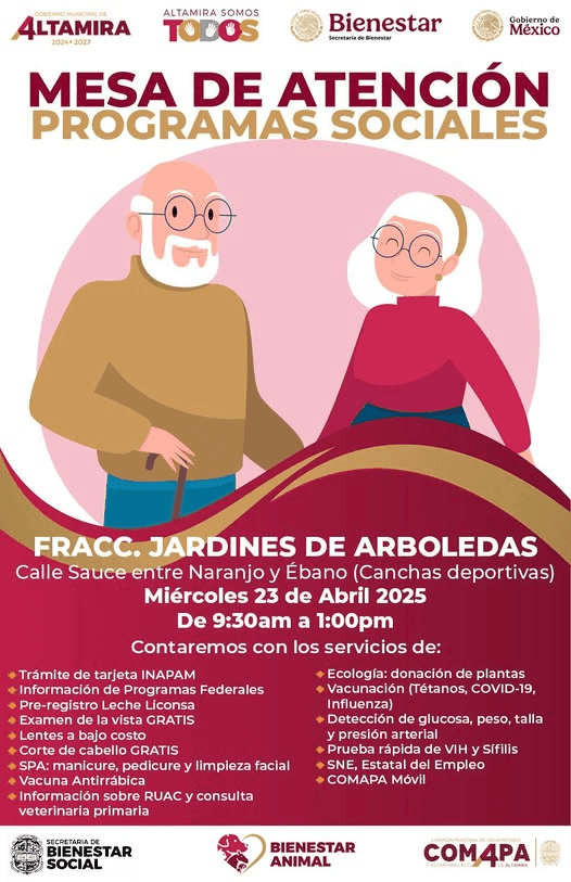 El Gobierno Municipal de Altamira, encabezado por el alcalde Dr. Armando Martínez Manríquez, a través de la Dirección de Bienestar Social, te invita a la próxima Mesa de Atención de Programas Sociales que se llevará a cabo en la colonia Jardines de Arboledas. Este es un excelente espacio para que los ciudadanos conozcan y accedan a los diferentes programas y apoyos disponibles para mejorar su calidad de vida.