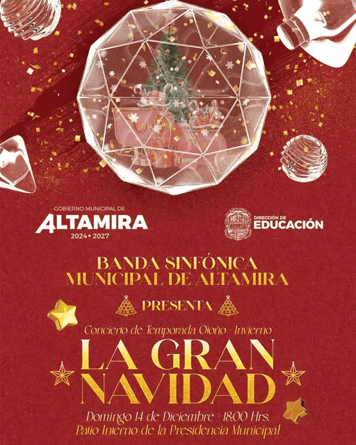 Vive una tarde especial en compañía de tu familia con la presentación de la Banda Sinfónica Municipal de Altamira, que ofrecerá su concierto de la temporada Otoño-Invierno La Gran Navidad. La cita es el 14 de diciembre a las 6:00 de la tarde, en el patio interno de la Presidencia Municipal de Altamira, Tamaulipas, para disfrutar de un ambiente lleno de música, tradición y espíritu navideño.