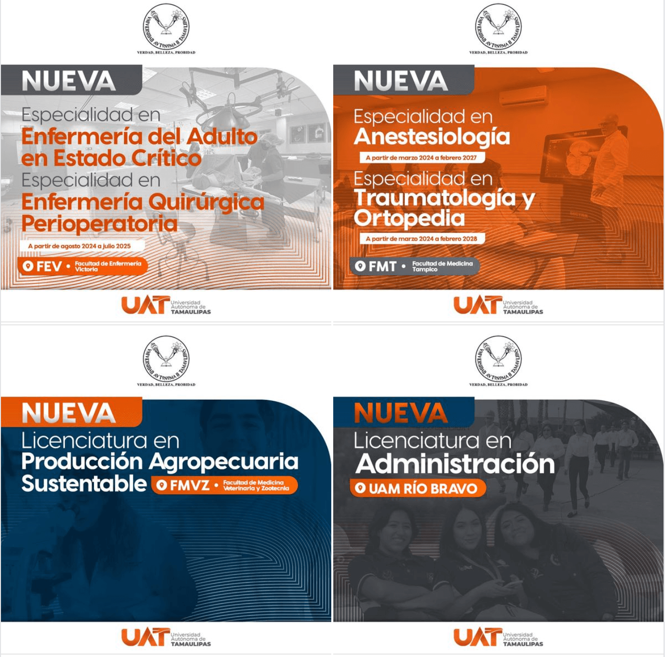 Estamos emocionados de compartirles que tenemos nuevas carreras y especialidades en las facultades de Facultad de Enfermería Victoria UAT, Medicina UAT Tampico, Facultad de Medicina Veterinaria y Zootecnia de la UAT y Unidad Académica Multidisciplinaria Rio Bravo – UAT, para el próximo ciclo escolar. ![]()