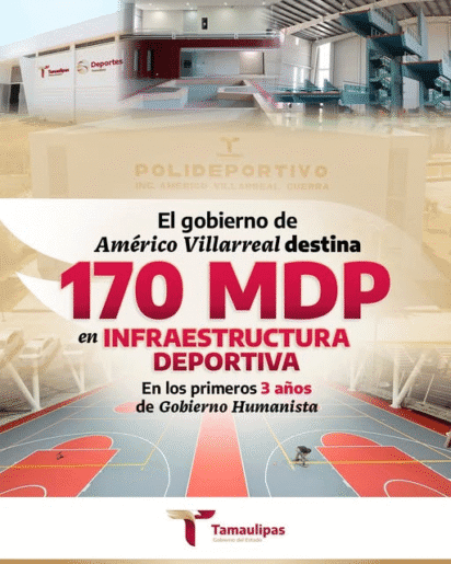 Se llevó a cabo la renovación de varios espacios deportivos en el estado. En Río Bravo, se rehabilitó el gimnasio Enrique Franklin Chanes, conocido como «Las Liebres». En Ciudad Victoria, se realizaron trabajos en el gimnasio Manuel Raga Navarro, además de construir una techumbre para las canchas de básquetbol y rehabilitar las de voleibol en la Unidad Deportiva Adolfo Ruiz Cortines. La capital tamaulipeca también vio la modernización de la fosa de clavados y la edificación de baños en el Polideportivo Américo Villarreal Guerra. Finalmente, se ejecutaron mejoras en las áreas de gimnasia y esgrima de la Unidad Deportiva Siglo XXI, también en Ciudad Victoria.