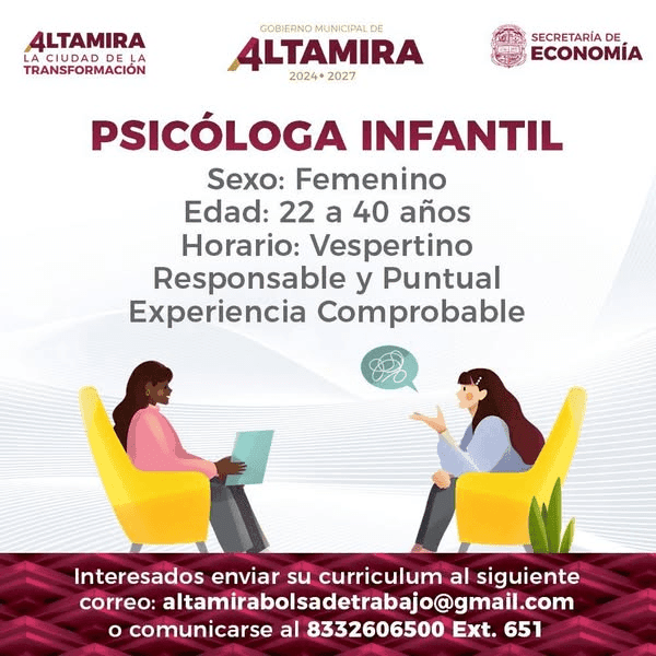 Envía tu CV en formato PDF a 📩 altamirabolsadetrabajo@gmail.com.