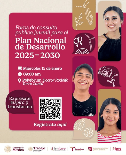 ¡Juventudes de Tamaulipas les tenemos una gran invitación, ya está abierta la convocatoria para los Foros de consulta pública para el “PLAN NACIONAL DE DESARROLLO 2025-2030”!💪🏼